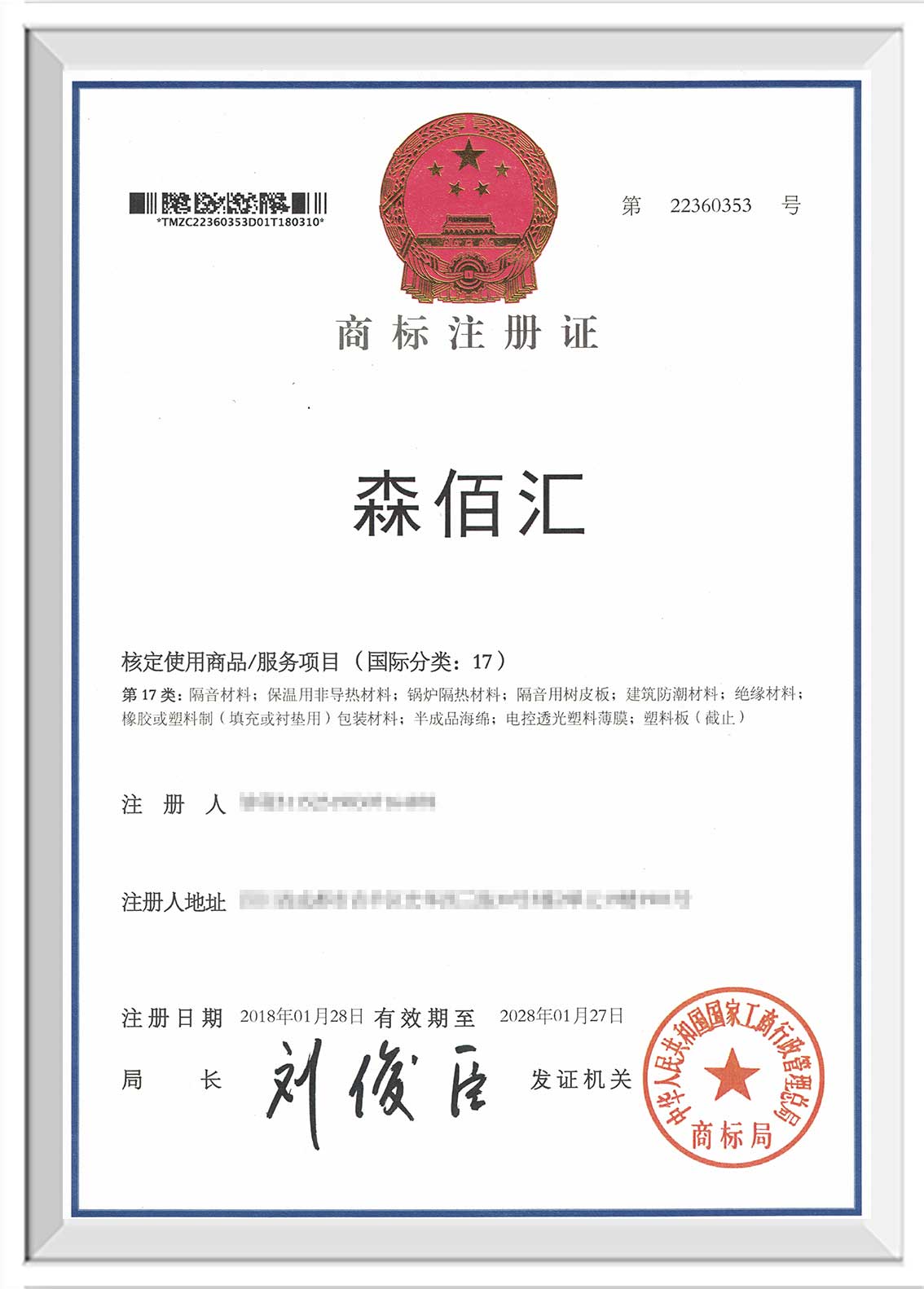漯河“森佰汇”商标证书下发至企业